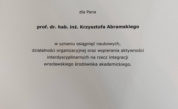 W tym roku nagrodę z rąk prezydenta Wrocławia Jacka Sutryka odebrał prof. dr hab.inż. Krzysztof Abramski ( Katedra Teorii Pola, Ukladów Elektronicznych i Optoelektroniki WEFiM).